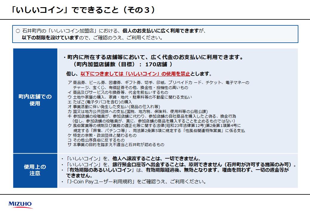 一方で「いしいコイン」は「送金」「預金口座に戻す」は不可とし、原則、使用期限がありますので、必ず期限内に町内の加盟店舗で利用していただくようになります。