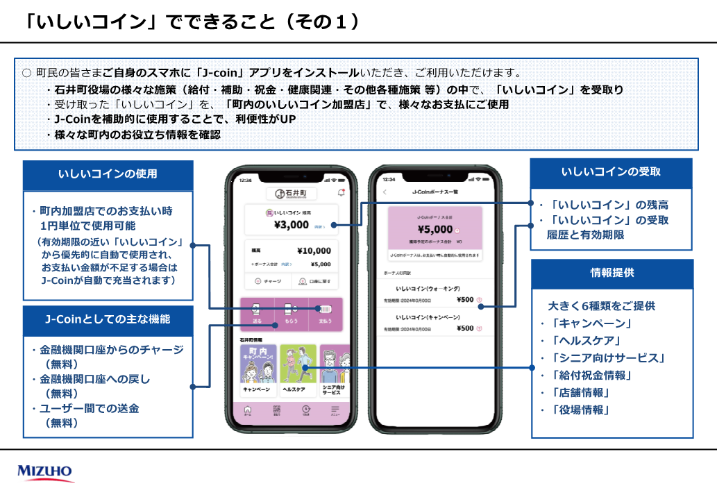 いしいコインは町民の皆さまご自身のスマホに「J-Coin」アプリをインストールすることでご利用いただくことができます。石井町の様々な施策の中で「いしいコイン」を受け取り、町内の加盟店での支払いに1円単位で使用することができます。(有効期限の近い「いしいコイン」から優先的に自動で使用されます。また、ユーザーの方がJ-Coinをあらかじめチャージしておきますと、いしいコインのみでお支払い金額が不足する場合は、J- Coinが自動で充当されます。)