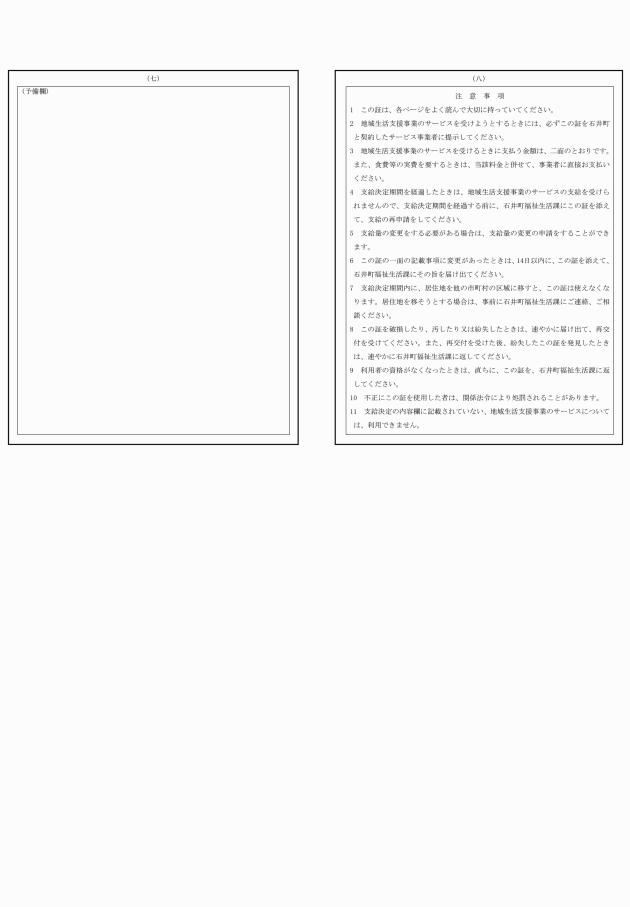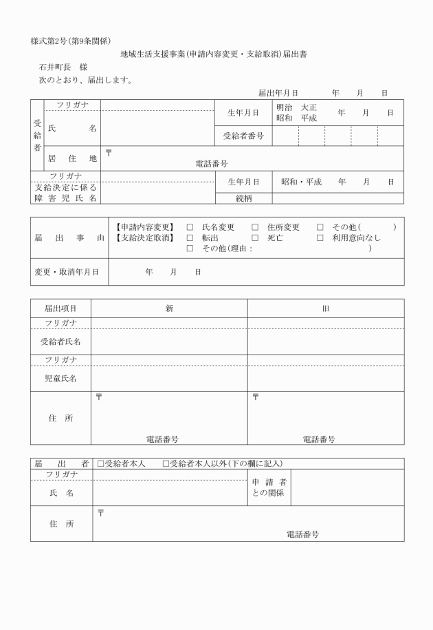 第6条 地域生活支援事業を利用しようとする者(以下「申請者」という。)は、地域生活支援事業(支給・支給変更)申請書(様式第1号)に町長が必要と認める書類を添えて町長に申請しなければならない。