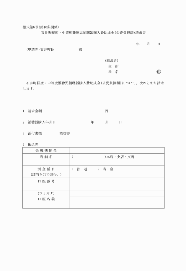 第5条 助成金の交付を受けようとする交付対象児の保護者(児童福祉法(昭和22年法律第164号)第6条に規定する保護者をいう。以下「申請者」という。)は、石井町軽度・中等度難聴児補聴器購入費助成金交付申請書(様式第1号)に、次に掲げる書類を添えて、町長に提出しなければならない。